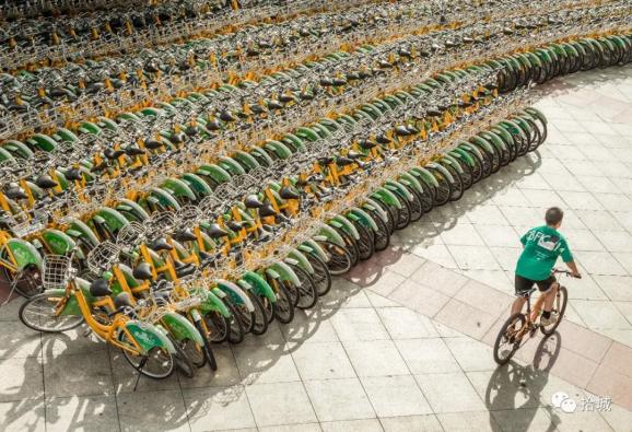 浏阳(湖南)-2023年7月23日,骑车的人从一堆等待维修的公用自行车旁边路过,公用自行车正慢慢地被共享电动单车所取代。拾城者 贺再亮