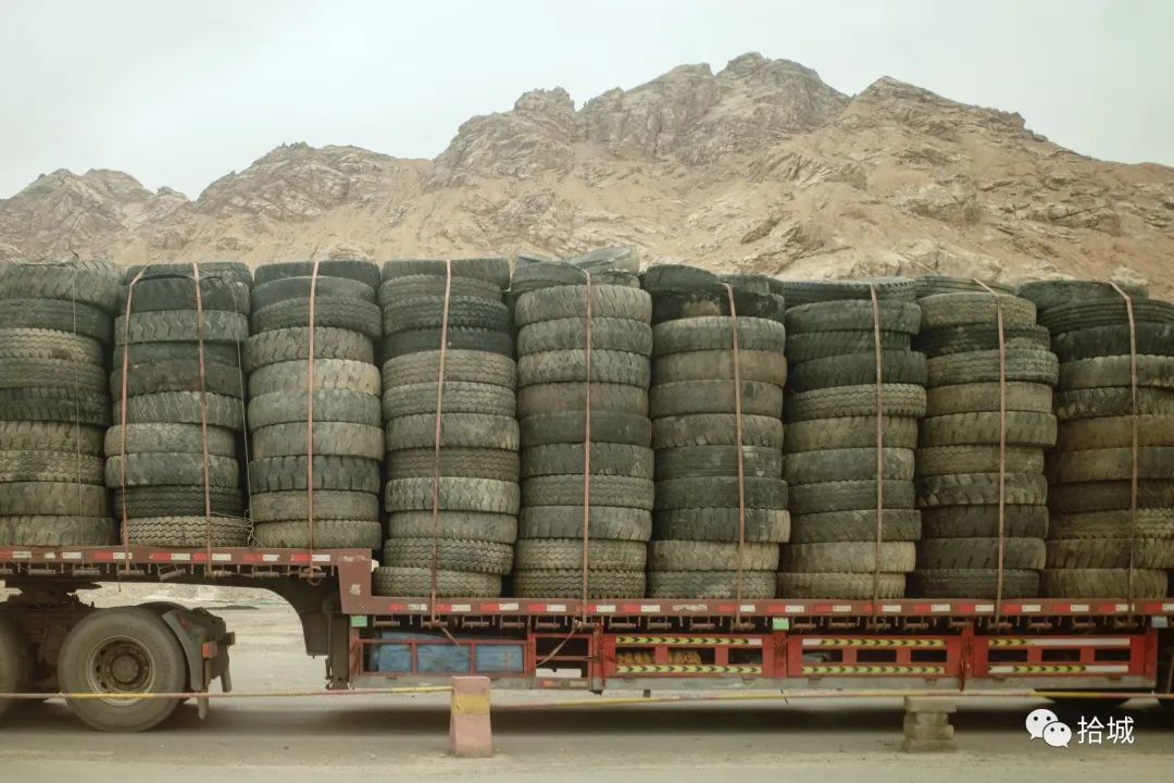 格尔木(青海)-2023年7月26日,109国道,满载轮胎的货车与背后的山体岩石。拾城者 郝文辉