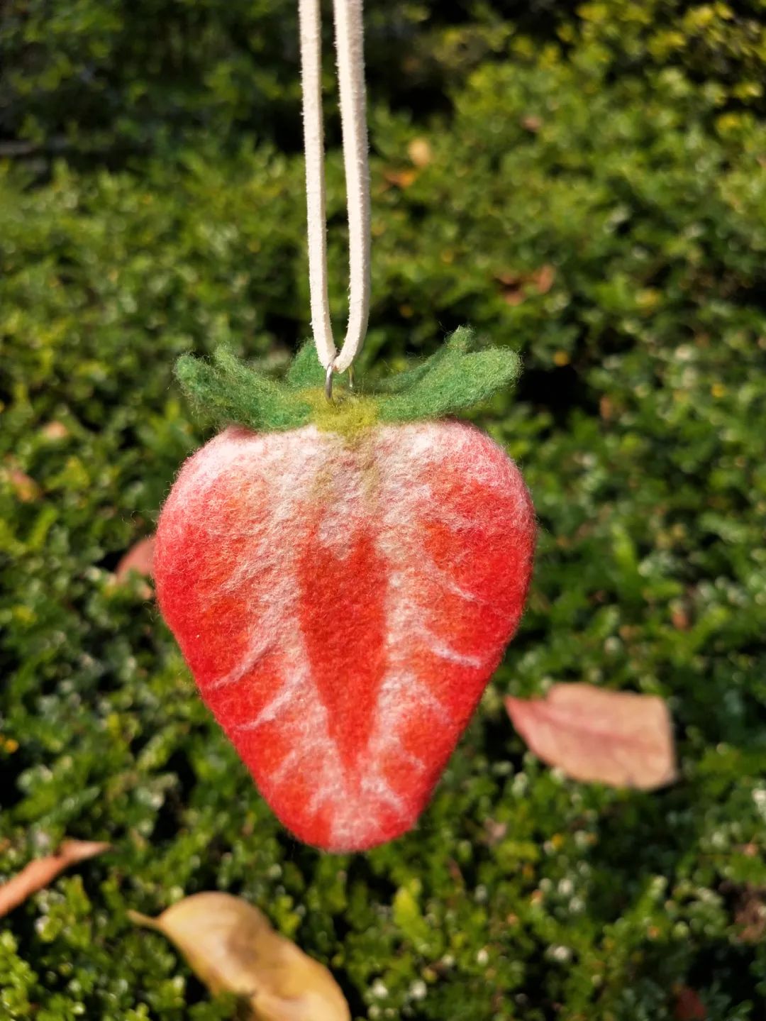 眠羊戳的草莓羊毛毡。(图/受访者提供)第一次戳是失业期间,经过2个下午和4个晚上,眠羊戳好了一个半切草莓——草莓很小,但十分结实,挂在背包上甩来甩去都不会散开。后来她还戳过西瓜和菠萝包,当作手机挂件。