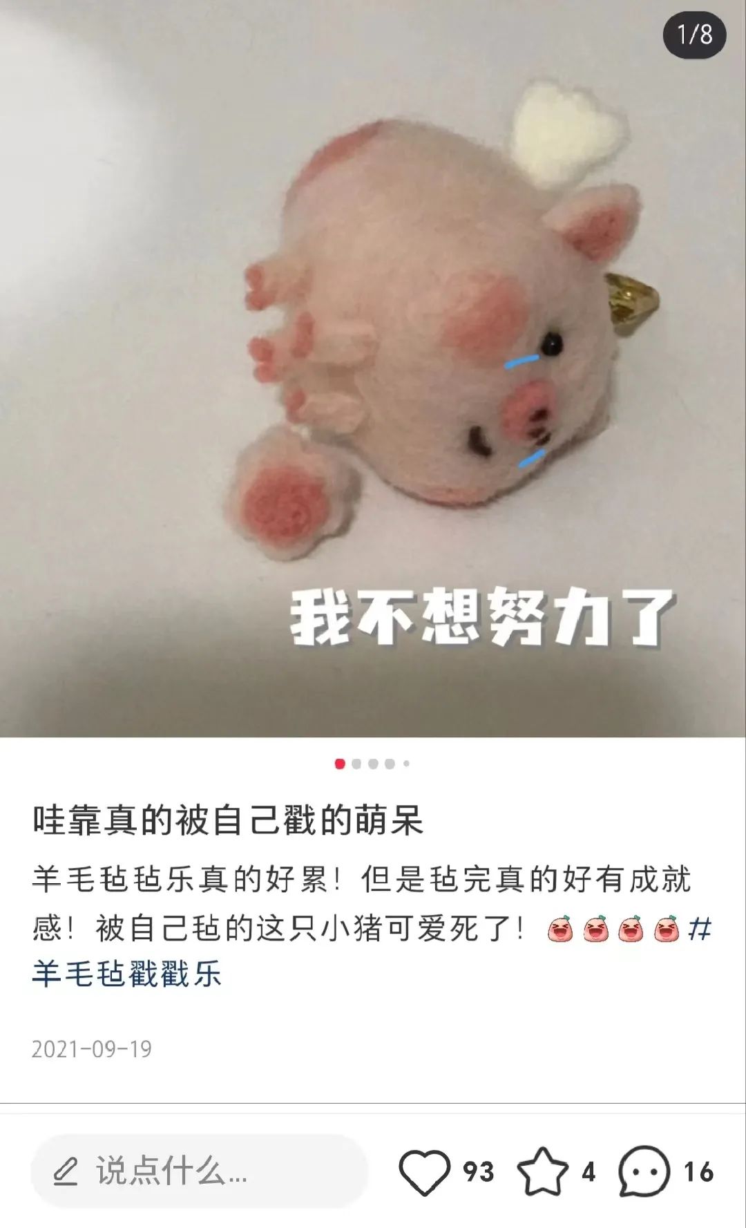 网友分享戳羊毛毡的感受。(图/小红书@小张努力开张)骆馅饼原本在北京一家画室担任儿童美术教师,她白天自由创作,偶尔戳戳羊毛,晚上与周末则被工作挤满——一个人带三十个儿童画画。