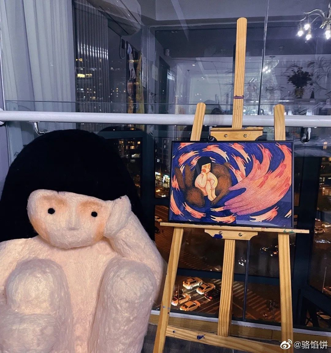 这个发呆女孩最早源于骆馅饼画的插画。2020年新冠肺炎疫情期间,在英国读研的骆馅饼,由于疫情没有毕业展览会展示作品,还滞留英国半年有余。