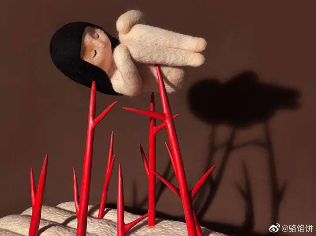 骆馅饼创作的插画。(图/@骆馅饼)后来,这些画成为了她被点赞无数的羊毛毡作品。原本羊毛毡只是她用学姐淘汰下来的羊毛和戳针玩一玩的,尝试了把一些作品戳出来以后,获得了很多人的喜欢,就越做越多,体积也越来越大。