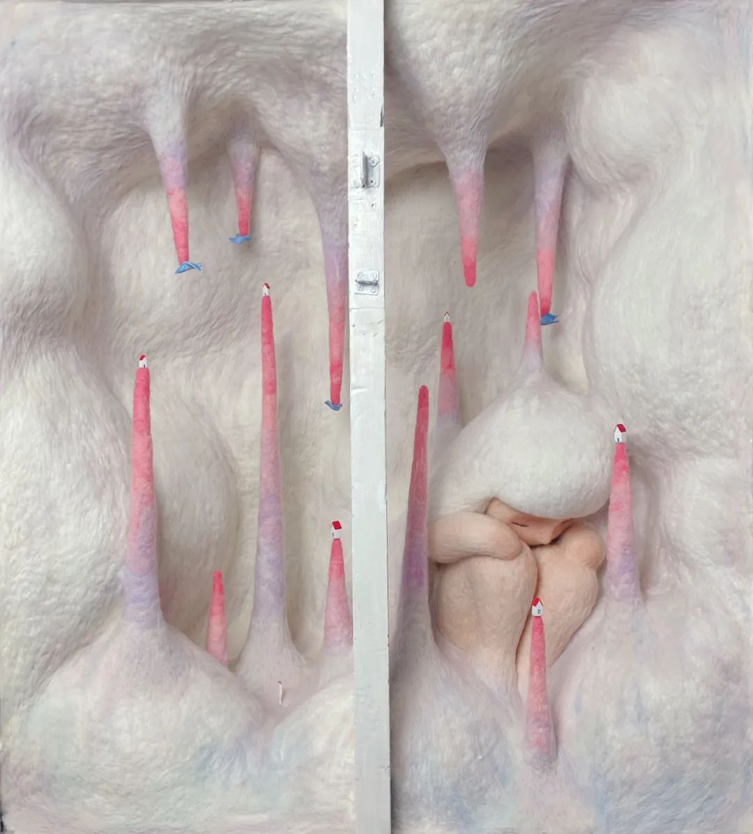 《躲在衣柜的小孩》作品。(图/受访者提供)在这个作品中,重峦叠嶂的梦幻山谷,像刺,又像妈妈的子宫。山谷顶端的房子,停留的蓝鸟,小女孩蜷缩着,看起来脆弱柔软,但又平静自洽。