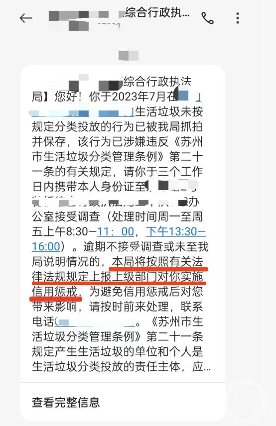 刘先生的短信截图显示,他未按规定分类投放生活垃圾的行为已被抓拍并保存,短信称他已涉嫌违反《苏州市生活垃圾分类管理条例》……逾期不接受调查或说明情况的,将按照有关法律法规规定上报上级部门“对你实施信用惩戒”。