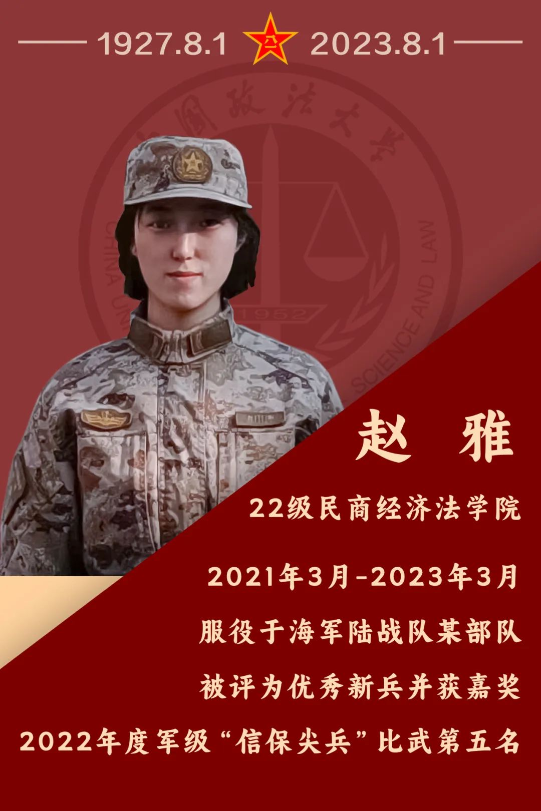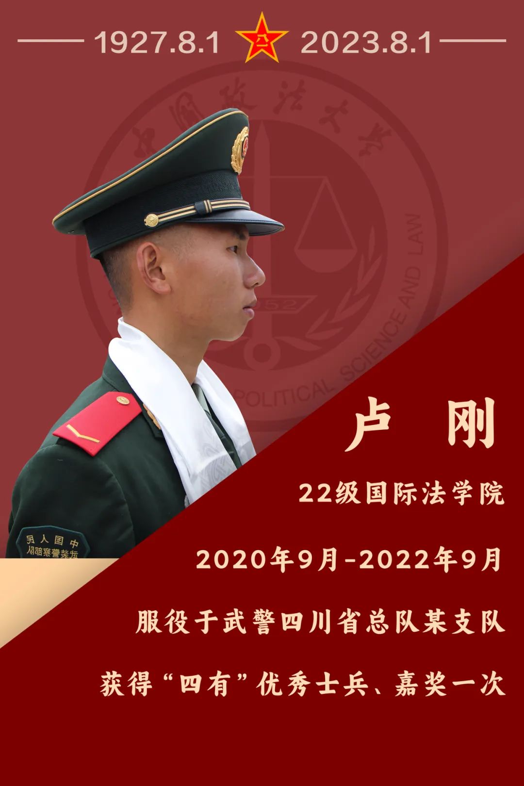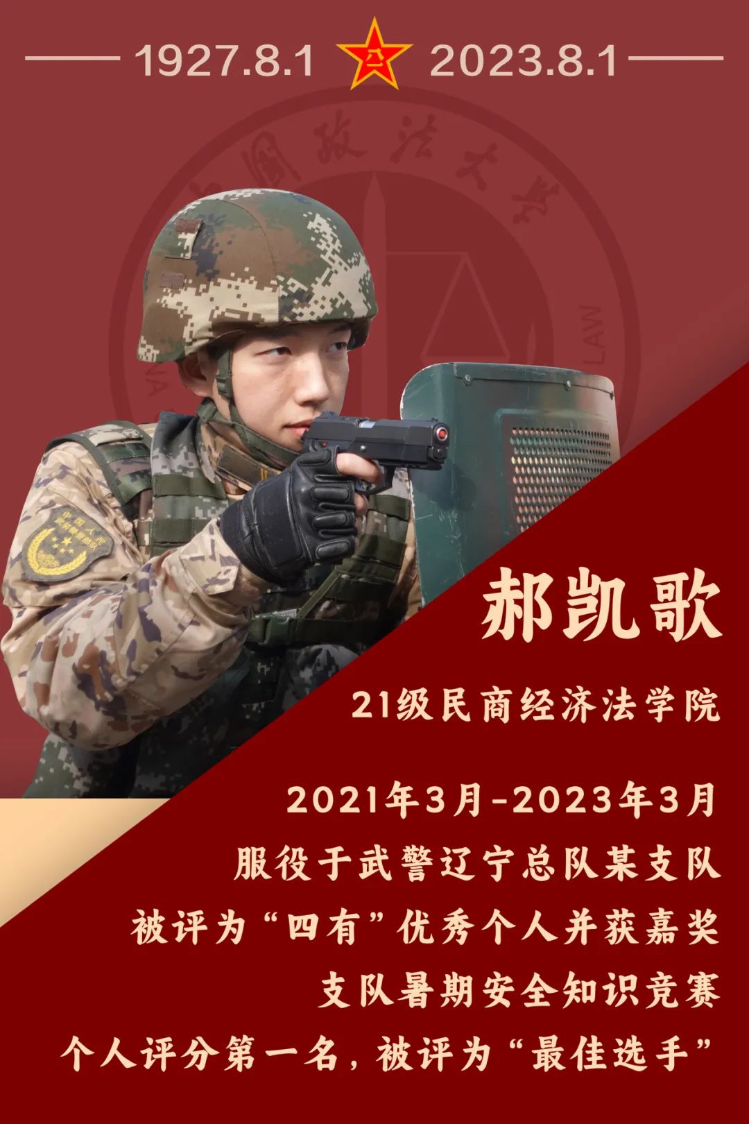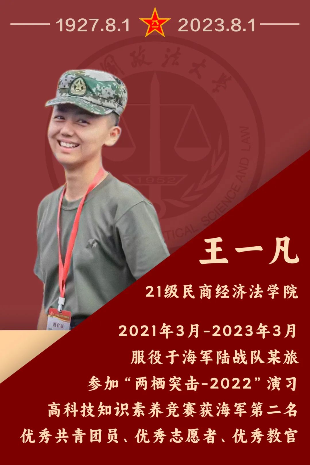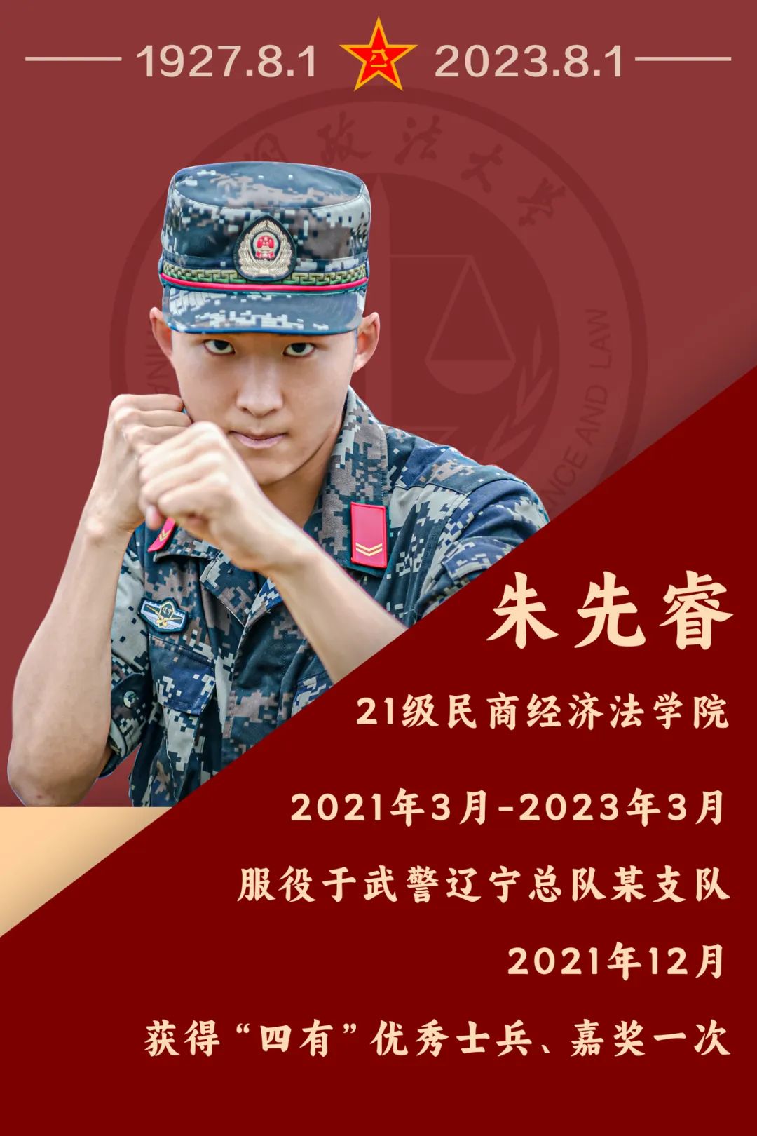 向军人致敬“愿得此身长报国,何须生入玉门关。”无数洋溢报国激情的法大学子积极响应国家号召参军入伍,选择将青春答卷谱写在训练场里、绿军营中,用实际行动参与人民军队建设发展,增添了个人在青春年华里的独特体验。中国人民解放军建军96周年,新一批退伍的法大学生回想起自己在军营中的故事,感触到军旅生活对青年成长的重要意义,他们有话说……