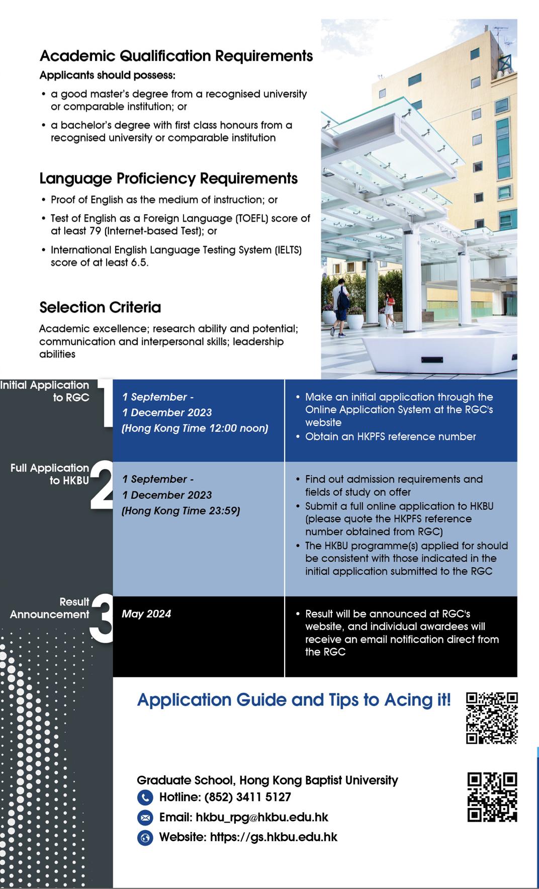 2023年9月1日起接受申报,RGC预申报获得Reference No, 之后香港浸会大学内部进行申报遴选确定Shortlists,限额报到RGC。