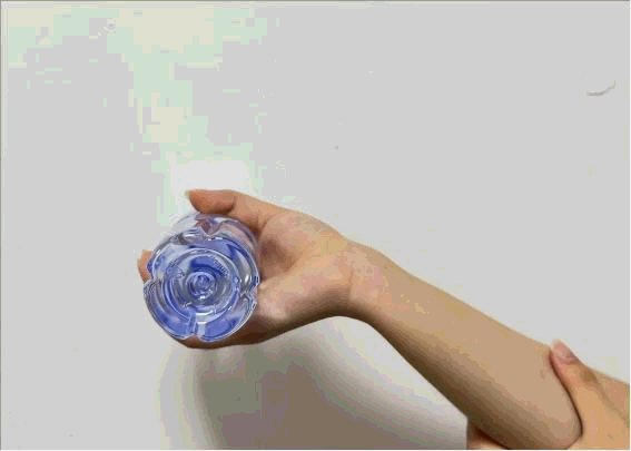 使用小哑铃(可用500ml左右矿泉水替代),手心向下,缓慢放松手腕,伸展手腕至末端,不要引起疼痛,放松手腕,重复10次 。