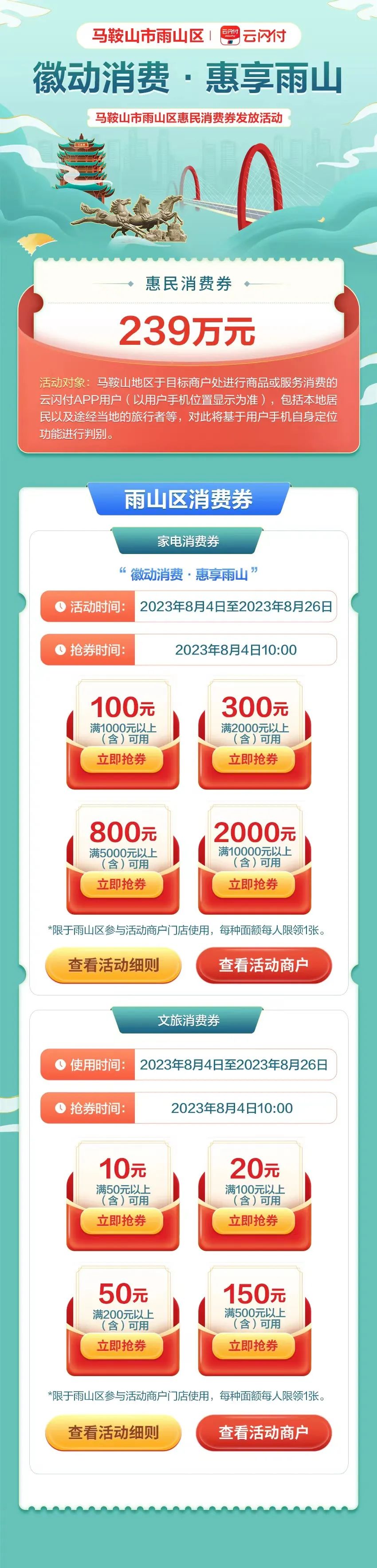 活动总额度239万元,限于雨山区参与活动商户门店使用,每种面额每人限领1张,先到先得,用完活动即停,消费券可叠加享受企业其它优惠活动。