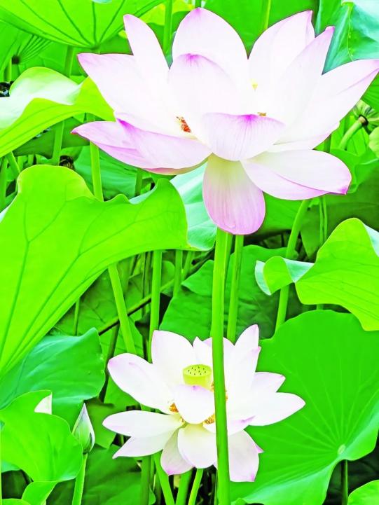 进入望丛祠内,鳖灵湖边,樟树林立,迂回曲折画廊挤满了人。人们举着手机仰着头,向湖里拍照。满湖荷叶举着翠绿的伞,遮掩水下的动与静,而伞底下,那一颗颗躁动的心,跃然而出,把一颗颗比拳头还大含苞待放的心举出荷伞,像粉色的画笔头,不知道它要为谁写下夏天湖边的故事。人工释放的水烟雾,绽放的荷花宛如仙境中的仙子,仙气飘飘。众人举着长枪短炮,拍摄心中的荷花仙子。有穿汉服与唐装的女子,手轻摇园扇坐在亭台栏上,与一朵荷花梦回大唐。湖中亭台,几个穿长裙的女子,举着花纸伞,用手机播放音乐,在阳光下与荷花翩翩起舞。众荷盛开,让我久久不想离开,直到小妹喊走下一个观赏点。