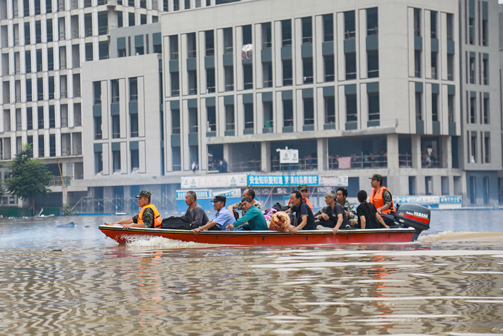 ↑8月4日,武警河北总队官兵在涿州内涝区域驾舟转移受灾群众。新华社发(江腾 摄)
