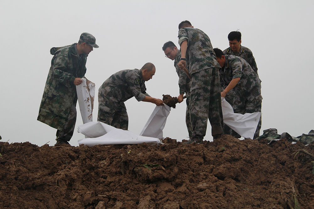 ↑中部战区陆军第82集团军“铁军旅”官兵在河北省高碑店市白沟河任务区加固岸堤(8月2日摄)。新华社发(邓青华 摄)