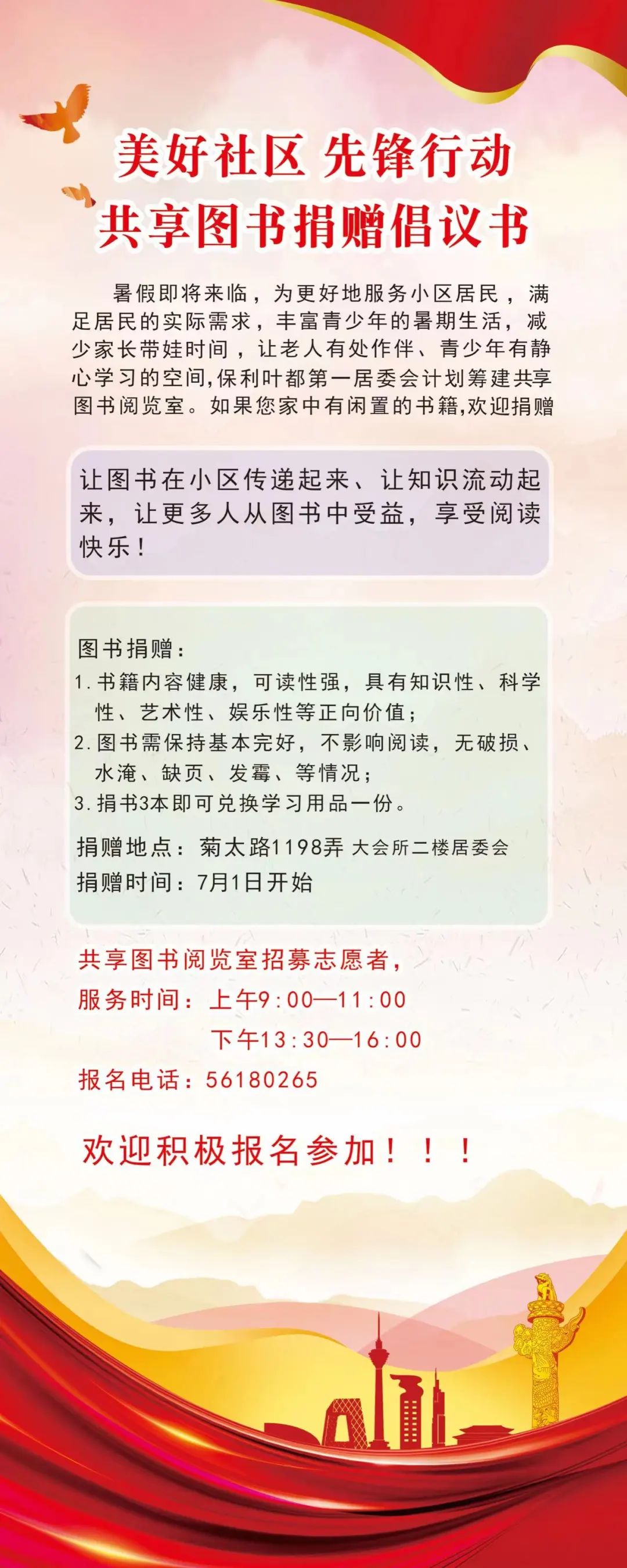 近日,保利叶都第一居委会发布了共享图书捐赠倡议书,要求捐赠的书籍内容健康、可读性强,具有知识性、科学性、艺术性、娱乐性等正向价值。活动伊始,社区内的党员、共青团员、青少年们纷纷捐出自己的各类珍贵藏书和闲置书籍。