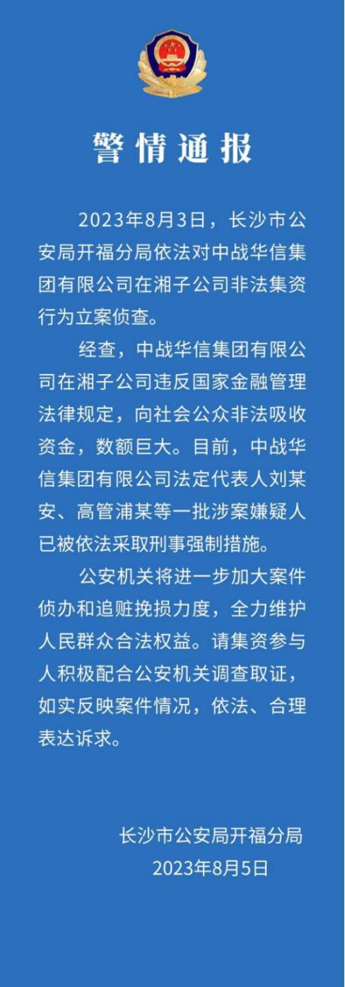 8月5日,湖南长沙市公安局开福分局发布警情通报称,8月3日,长沙市公安局开福分局依法对中战华信集团有限公司在湘子公司非法集资行为立案侦查。