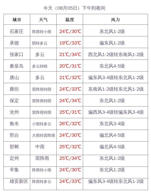 今天下午到夜间,张家口、承德北部、唐山、秦皇岛多云,其他地区多云间阴有雷阵雨或阵雨,其中石家庄、沧州南部、衡水、邢台、邯郸有中到大雨,局地有暴雨,雷雨时局地伴有短时强降水、短时大风等强对流天气。沿岸海域和沿海地区有东北风6到7级,阵风8级。