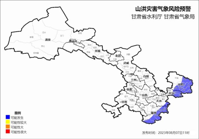 甘肃省水利厅、甘肃省气象局于2023年8月7日11时联合发布山洪灾害气象风险蓝色预警:预计8月7日11时~8月7日20时,陇南市武都区、成县、文县、康县、徽县、两当县,天水市麦积区,平凉市崆峒区、泾川县、灵台县、崇信县,庆阳市西峰区、庆城县、华池县、合水县、正宁县、宁县、镇原县等地区将有短时强降水,最大小时雨强为30-60mm。上述地区可能发生山洪灾害(蓝色预警);其他地区也可能因局地短历时强降水引发山洪灾害,请相关部门注意做好实时监测、防汛预警和提请危险区人员转移避险等防范工作,社会公众注意防灾避险。