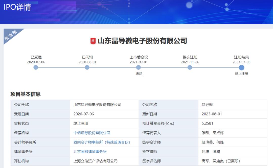 山东晶导微电子股份有限公司(简称“晶导微”)2021年9月1日创业板IPO审核过会时,本以为很快就能登陆深交所,为济宁再添一家上市公司,不想经过近两年的等待后,2023年8月初晶导微终止注册,上市进程戛然而止。据悉,这也是2023年内首家在IPO注册环节终止的创业板拟上市企业。