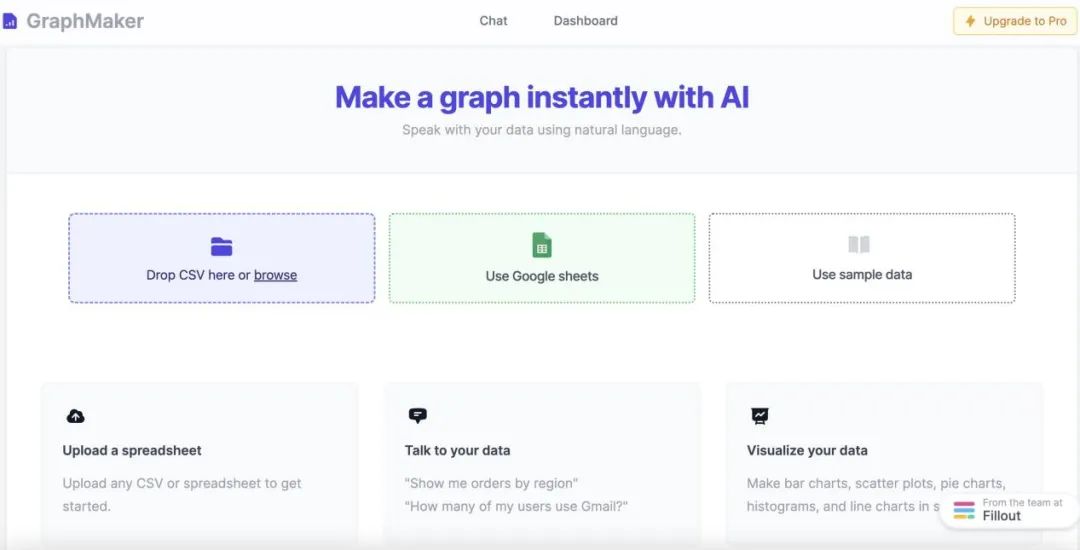 1.准备好CSV或谷歌表格类型的数据,通过网址打开网页(https://www.graphmaker.ai/chat),根据文件类型上传电子表格;