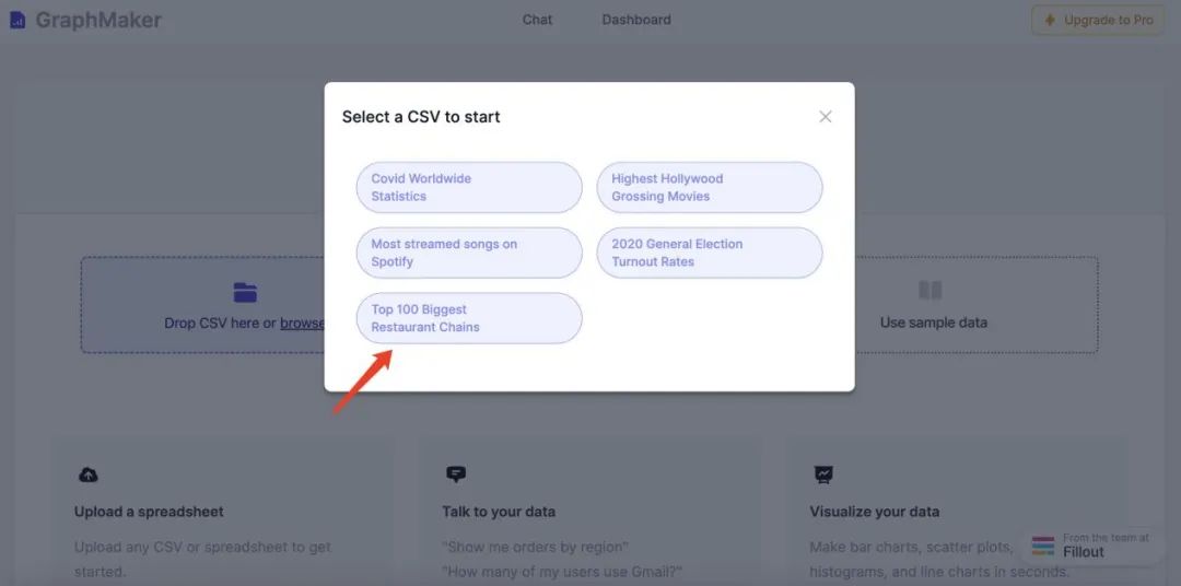 中间部分即核心区,也是GraphMaker使用的第一步。GraphMaker支持CSV表格或谷歌表格两种类型,图中紫色“Drop CSV here or browse”与绿色“Use Google sheets”方块即可以根据用户所有的表格类型进行选择性上传。同时,GraphMaker也非常人性化地给用户提供了CSV格式的案例样本数据库,用户初次进行软件体验时即可以选取样本数据库里的数据表格开启与人工智能的对话。