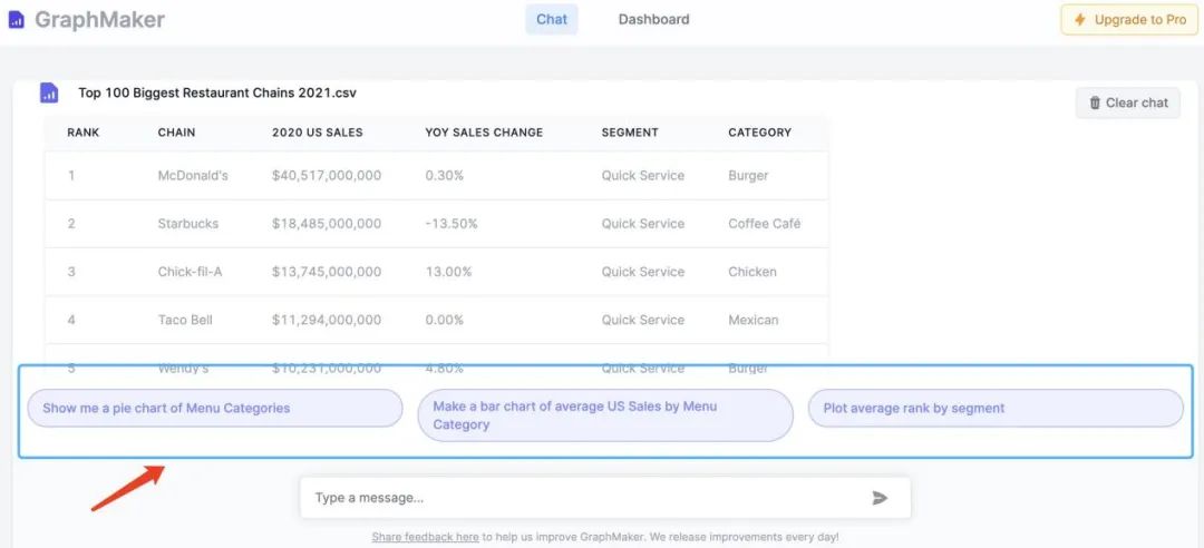 到了对话框界面,用户如果不知道如何提问也不用担心,GraphMaker自动分析表格内容后进行了问题推荐(图3蓝框部分),用户可以随意选择问题,逐一进行提问尝试。