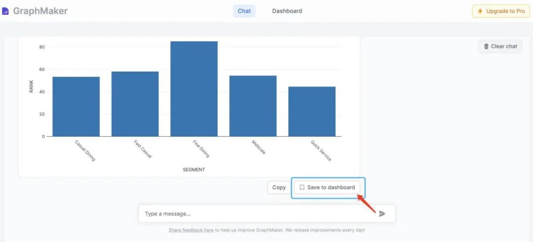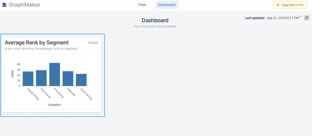 首次提问可以根据提示来,比如选择“Plot average rank by segment(按餐饮特点分段绘制平均等级)”,可以得到一个按照“休闲餐饮”、“快速服务”这些分段区分形成的柱状图。根据图4、图5我们发现很难在一个画面内呈现完表格名称、图表主体以及分段x轴的内容,此时我们就可以用到前文提到的Dashboard。点击图5箭头所指的“Save to dashboard”区域即可将AI生成的可视化图表清晰完整地保存到Dashboard(图6),便于用户查看。