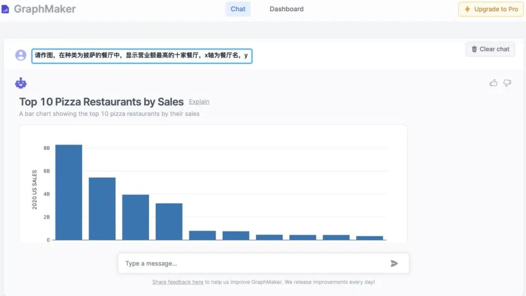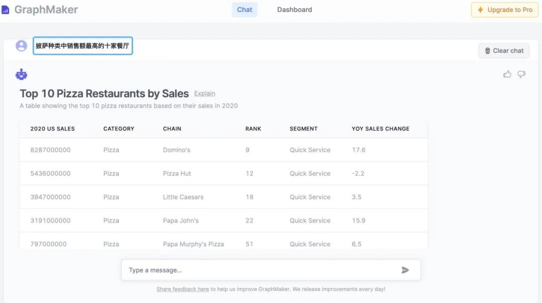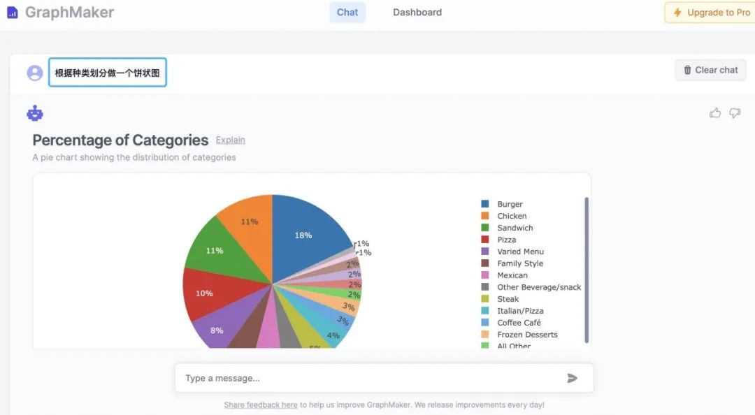 上一段对话我们根据推荐提问使用了英文方式,也许有用户犯了难,自己英文不好,使用的时候问完推荐的问题后该怎么办?其实GraphMaker也能识别中文,不用担心因为语言而沟通受阻。
