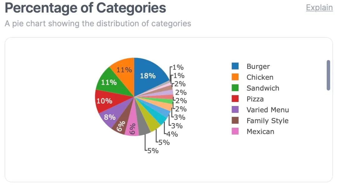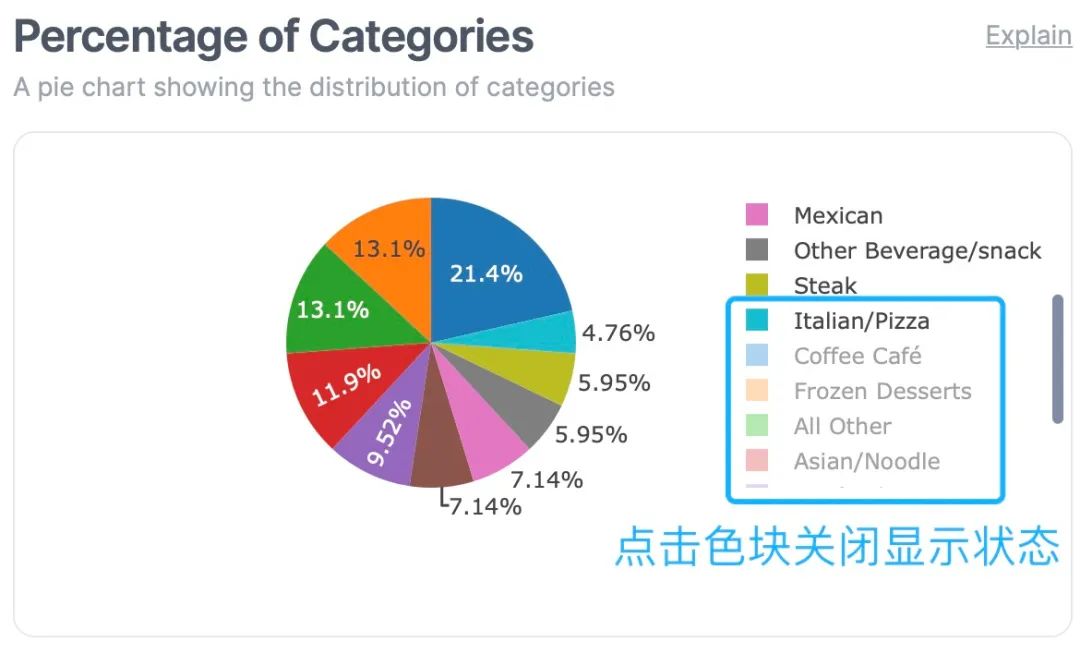 但是,18种餐饮类别,繁多的颜色区分也会让用户眼花缭乱(图8)。GraphMaker自有解决办法,我们探索出了一个好用的小技巧,当单击图例时,相应的种类会从饼状图内暂时消失,我们尝试关闭了占比较小的那一部分类别,保留占比排在前十的种类进行对比(图9),视觉观感上舒适度提升,也更凸显汉堡类餐饮店“断崖式”领先的情况。