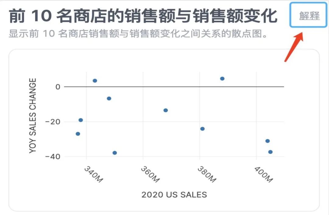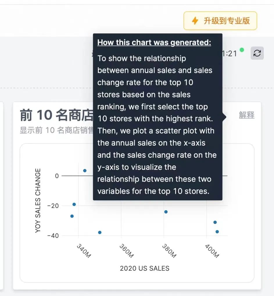 你可以向它提问“利用合适的图表分析销售排名前十店铺年销售额与年销售额变化率之间的关系”,它除了可视化用户需求的结果外,用户还可以通过图表左上角的“Explain”(图13)了解学习图表计算的过程(图14)。