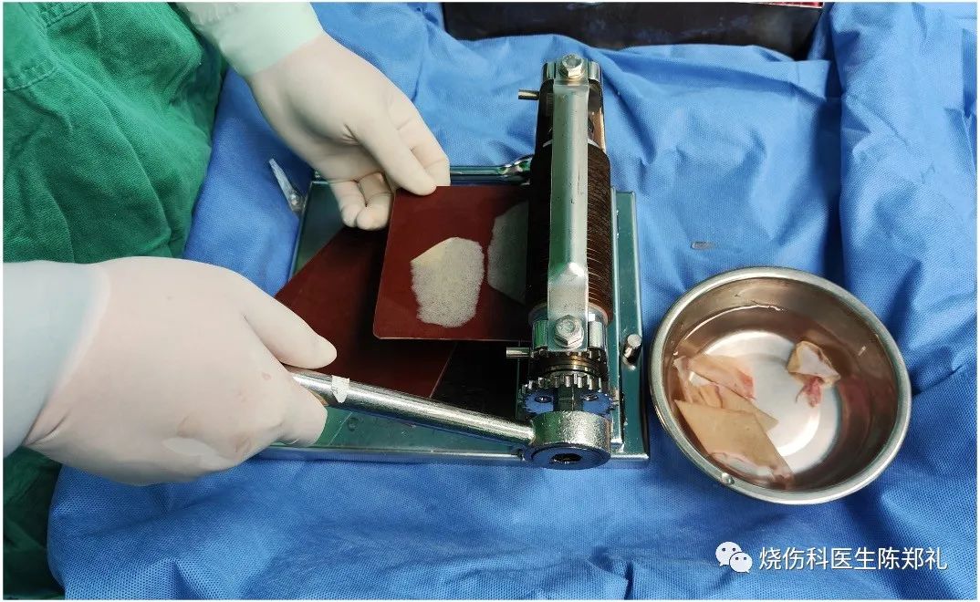 取完皮以后,如果把皮片完整地移植就叫作“大张植皮”;但是一般情况下,皮片都会再加工处理一下。比如在皮片上均匀地开一些小洞,制成网状,叫“网状植皮”;还有更常用的加工方法是把皮片制作成一小块一小块,像邮票一样,叫做“邮票植皮”。轧皮机就是完成这种操作的机械装置。特别是对于大面积烧伤患者的救治,邮票植皮术是必不可少的利器。不但可以控制皮片的扩张倍数,还具有很好的抗感染能力,这种技术曾经在我国拯救过成千上万的烧伤患者。