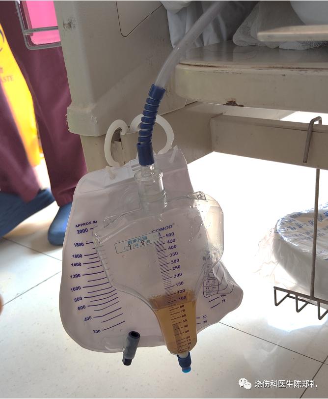 大部分病人如果要留置导尿,都会连接集尿袋,为啥烧伤科需要集尿瓶呢?因为使用瓶子,可以数尿液的滴速,也就是说,可以更加实时精确地知道——此时此刻,患者的肾脏功能处于什么状态。比如:当我们观察到危重病人的集尿袋里有满满一袋尿的时候,并不能表示这个病人的肾脏功能很好。因为这是之前几个小时的尿量,患者目前可能已经一个小时没有小便出来了。休克期的病人,内环境情况瞬息万变,这就要求医生蹲着数滴速,来观察当下的患者肾功能的情况。