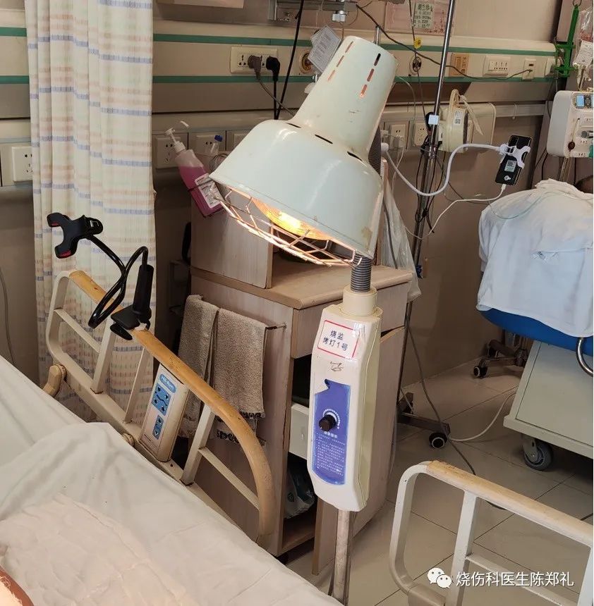 因为烧伤创面有时候渗出液非常多,自然风干无法及时带走外敷料上的水分,这时候就需要烤灯这种装置来帮助蒸发,确保敷料的干燥。同时,也可以降低创面周围的环境湿度,避免伤口感染。