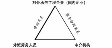 1.对外承包工程项下的外派劳务法律关系对外承包工程项下外派劳务法律关系的主体包括对外承包工程企业、外派劳务人员,若通过中介机构招用劳务人员,则还包括中介机构。三主体间法律关系如图1所示:
