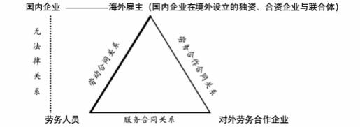 2.对外劳务合作法律关系国内企业不直接作为承包合同的签约主体,而是以在境外设立独资公司、合资公司或者联合体 (统称为中资企业/机构)作为主体承包该外工程,通过国内对外劳务合作企业招募劳务人员。此用工模式下海外雇主、对外劳务合作企业以及劳务人员三方主体间法律关系图2所示: