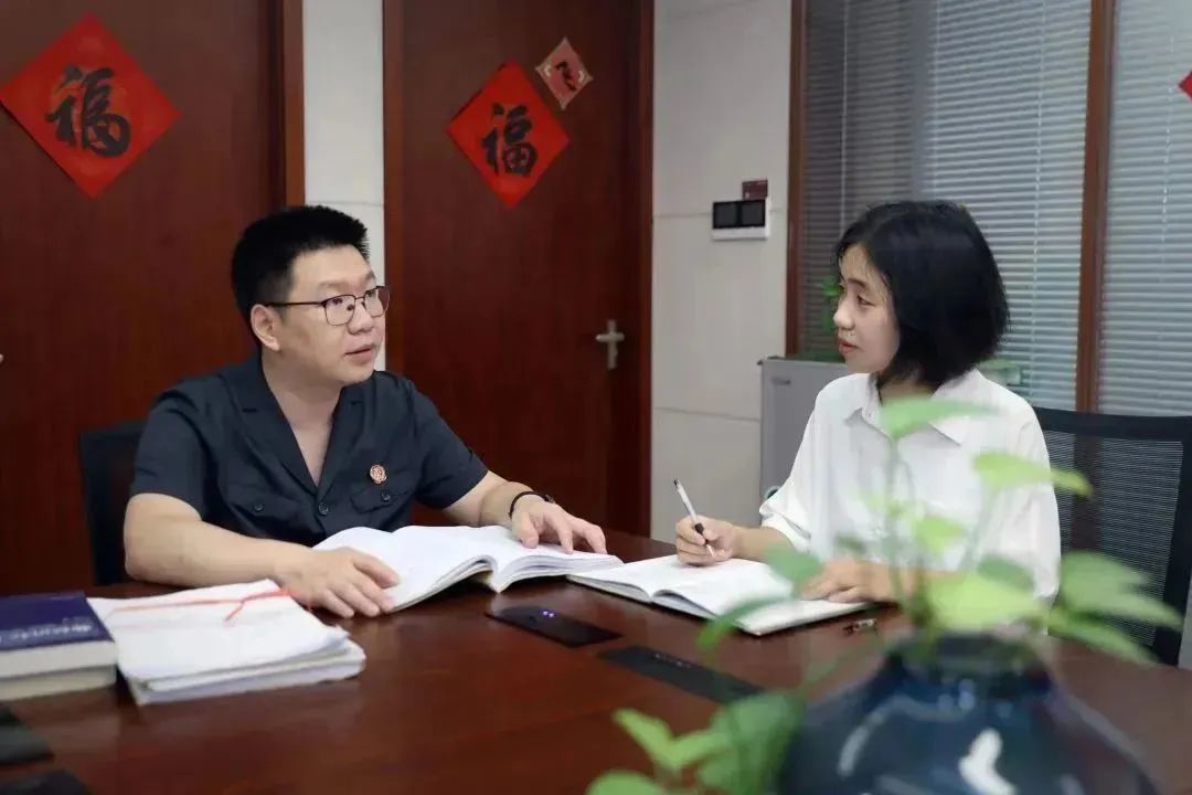 △张荣(江南大学法学院2022级硕士研究生)在向她的师傅宁尚成(无锡中院立案二庭副庭长)汇报近期学习成果。