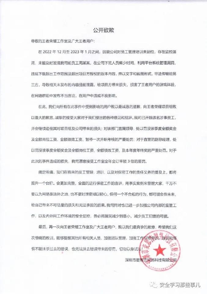 原标题:《警惕 | 泄密《王者荣耀》内容 供应商遭3倍重罚发表声明致歉》