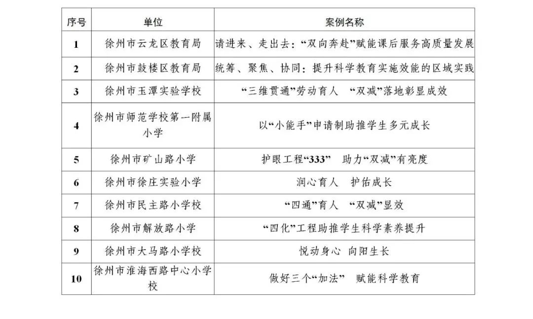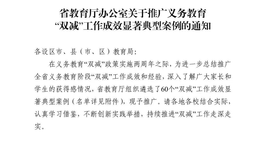 在义务教育“双减”政策实施两周年之际,为进一步总结推广全省义务教育阶段“双减”工作成效和经验,深入了解广大家长和学生的获得感情况,近日,江苏省教育厅办公室印发《关于推广义务教育“双减”工作成效显著典型案例的通知》,公布了60个“双减”工作成效显著典型案例,我市共有10个案例成功入选,位列全省地级市首位。