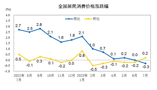 8月9日,国家统计发布数据,中国7月份居民消费价格(CPI)同比下降0.3%,略高于市场预期,环比上涨0.2%。1-7月平均,全国居民消费价格比上年同期上涨0.5%。