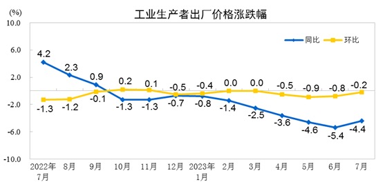 7月份,全国工业生产者出厂价格(PPI)同比下降4.4%,基本符合市场预期,环比下降0.2%,工业生产者购进价格同比下降6.1%,环比下降0.5%。1-7月平均,工业生产者出厂价格比上年同期下降3.2%,工业生产者购进价格下降3.5%。