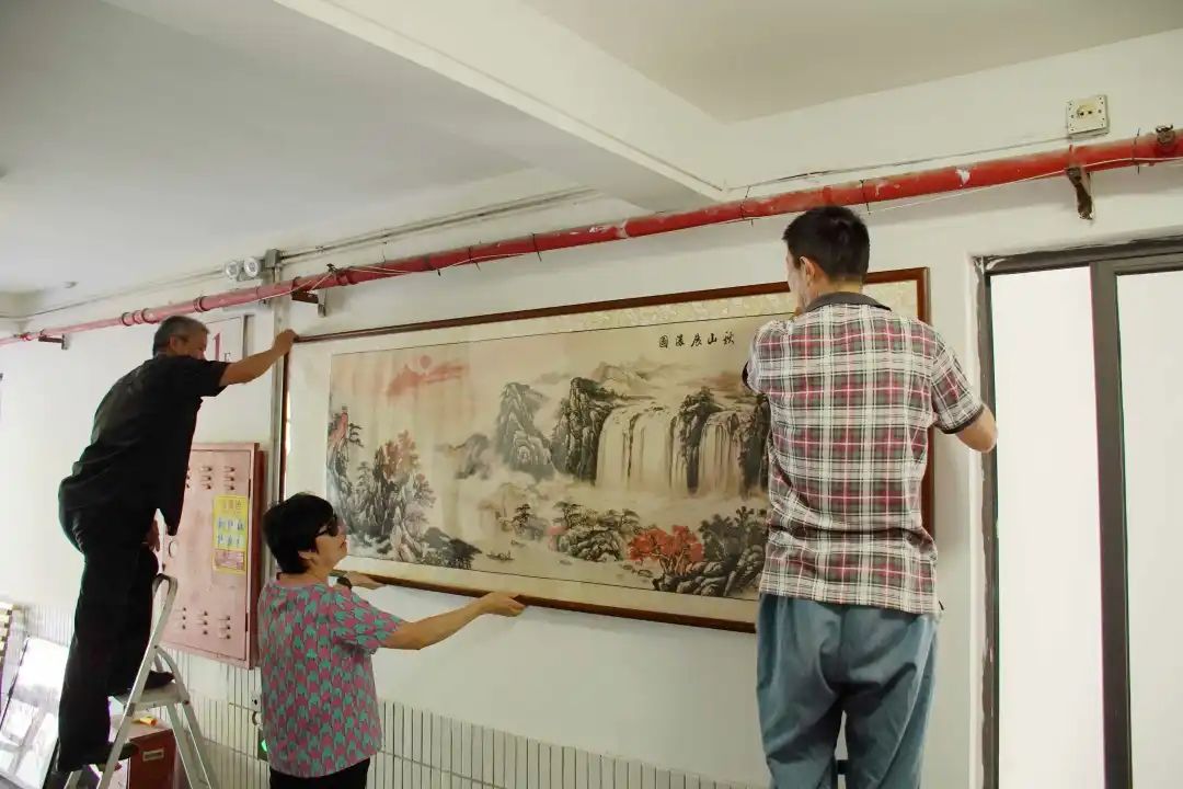 一早,窗外的天空还是黑蒙蒙的,居民李孟生和商京兰早已起身在家里“捣鼓”,巨幅剪纸《八骏图》、山水国画、字画……两人把一件件各自的得意之作贡献出来,居民们则热情参与“家门口”的事,一起布置楼道。