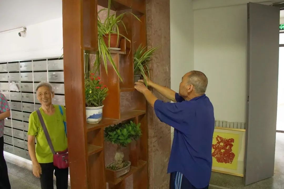 本着这个简单的想法,两人足足准备了半年多。共有54幅(22幅剪纸+32幅字画)李孟生的剪纸作品和商京兰的字画作品在这广宇大楼里“展出”,得到了左邻右舍的一致称赞,也引来不少居民的共同参与。“剪纸、字画我不会,但我家盆栽不少,放到这里可以一起欣赏”,75岁的邵老伯从家里搬来了盆栽虎刺、六月雪。80岁的陈阿姨又搬来了绿萝、榕树……大家自发帮忙,楼道被绿植环绕,白墙打造成了文化的展示地。关上门是“小家”,打开门是“大家”。居民们伴着“墨香”回家,一天的压力瞬间得到释放,在居民陆师傅看来,这些作品将邻里情用书画、剪纸记录下来,不仅为楼道增添一抹诗情画意,提升了大楼的风格品味,更是大家和谐邻里情的缩影。