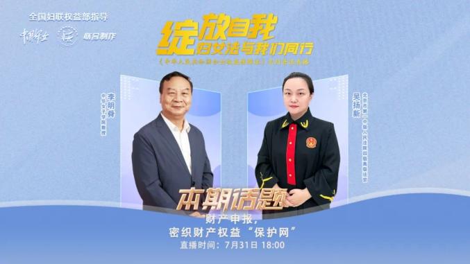 7月31日,由人民法院新闻传媒总社和中国妇女杂志社联合推出的新妇女权益保障法系列普法直播第二场《财产申报,密织财产权益“保护网”》在人民法院报视频号、微博,中国妇女杂志全媒体“帼姐”快手、微博、视频号,中国法院网抖音、快手号,天平阳光APP,中工网微博、网站,法治中国60分,搜狐政务等平台同步播出。中华女子学院教授李明舜、北京市第一中级人民法院四级高级法官吴扬新做客直播间,与收看直播的60余万网友分享了关于妇女财产权益保障的那些事儿。