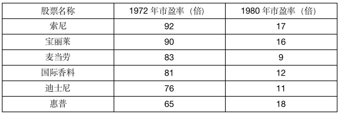 在《漫步华尔街》一书中,记录了美国“漂亮50”在1972年的市盈率水平,以及估值泡沫破灭之后1980年的市盈率水平。