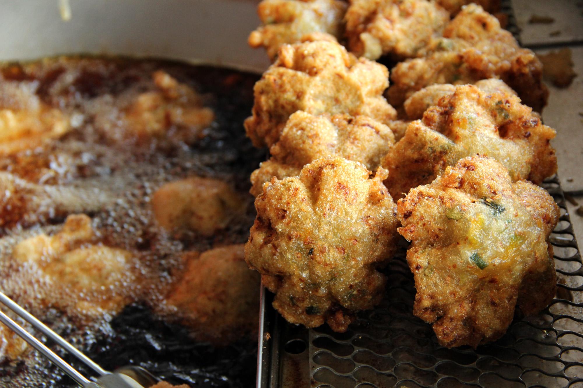 浮粿在炸制时,选用新鲜海蛎、瘦肉腌制,使口感更加鲜嫩,再与本地地瓜粉、南瓜丝、包菜丝等材料和成浆状,盛于五角形模具里定型并放入油锅中,待浮粿从模具上脱落,浮在油锅上,呈金黄色时便可出锅了,皮薄而酥脆,内里弹而不黏,是最正宗的泉港味。