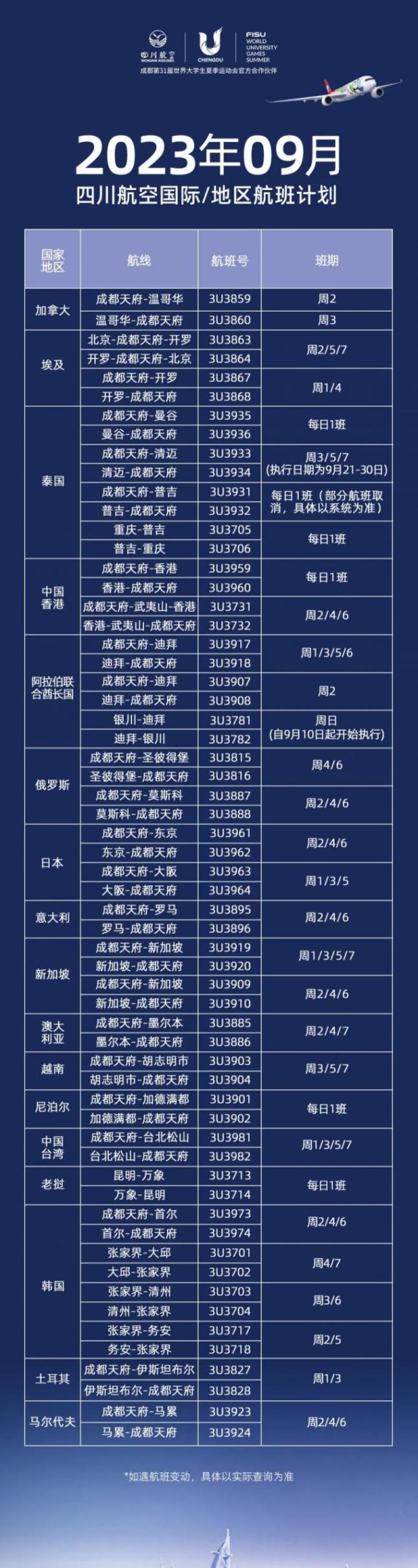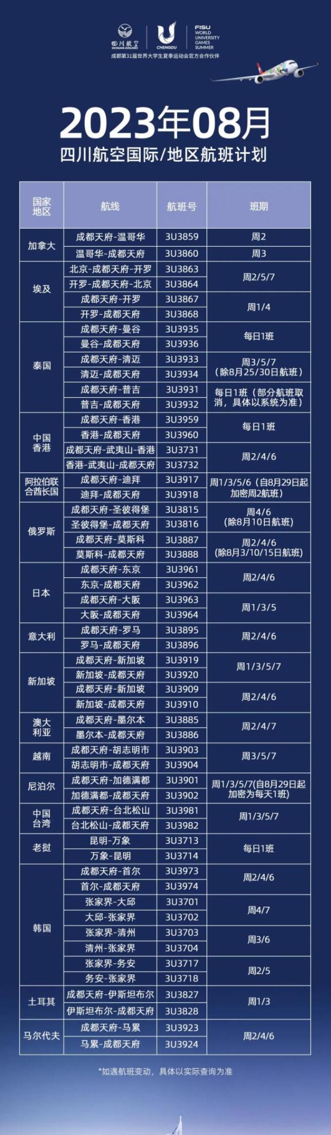 注:以上航班均为当地时间,如遇航班变动,请以实际查询为准。四川航空8月国际、地区航班计划