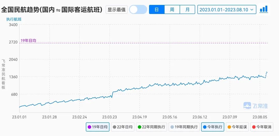 据飞常准数据,今年1月1日-8月6日,民航累计执行国际及地区客运航班18.07万班次,同比增长794%,较2019年同期下降69%。