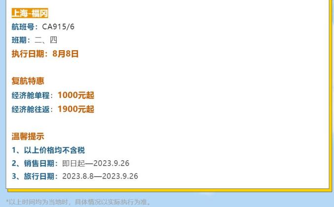 自2023年8月8日起,国航上海-福冈CA915/6航班将恢复运行,每周两班。