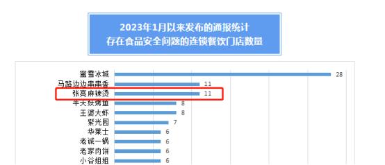 据7月28日北京市消费者协会的数据,通过对2023年1月以来市、区市场监管局发布的食品安全问题情况通报进行统计,其中有11家张亮麻辣烫门店存在食品安全问题。