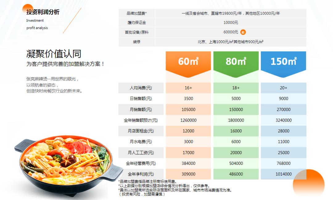 张亮麻辣烫官网显示,公司品牌加盟费分为两档,其中一线及省会城市、直辖市1.98万元/年,其他地区1万元/年,另需缴纳保证金1万元,首批设备/原料费6万元起;店铺面积则分为60平方米、80平方米及150平方米三档,装修费用为北京、上海1000元/平方米、其他城市900元/平方米。