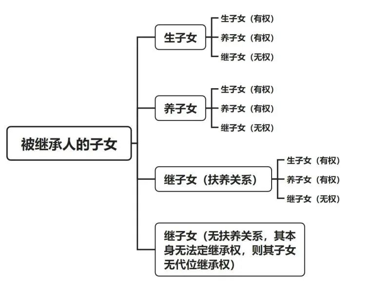 被继承人的子女(含生子女、养子女、形成扶养关系的继子女)的生子女、养子女,均属晚辈直系血亲范畴,享有代位继承权。在一般的法定继承中,形成扶养关系的继子女,都是法定继承人。但在代位继承中,被继承人子女的继子女,无论是否与被继承人的子女形成扶养关系均不属于晚辈直系血亲,不能代位继承。