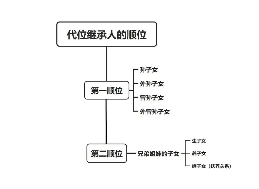 民法典第1128条,被继承人的子女先于被继承人死亡的,由被继承人的子女的直系晚辈血亲代位继承。被继承人的兄弟姐妹先于被继承人死亡时,由被继承人的兄弟姐妹的子女代位继承。代位继承人一般只能继承被继承人有权继承的遗产份额。