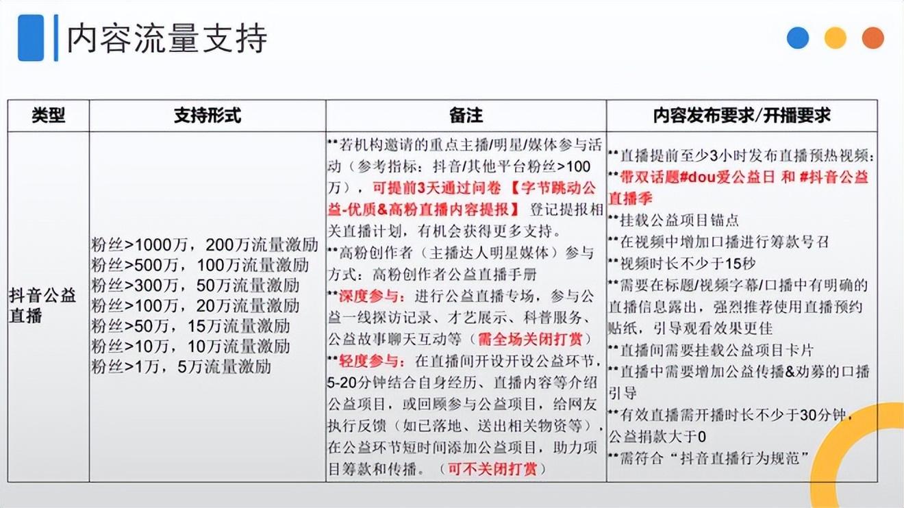 - 若机构邀请的重点主播/明星/媒体参与活动(参考指标:抖音/其他平台粉丝>100万),可提前3天通过问卷 【字节跳动公益-优质&高粉直播内容提报】登记提报相关直播计划。